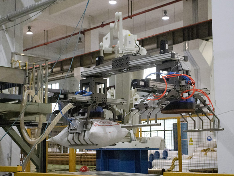 道金研發(fā)的“軟包物料智能拆垛-機(jī)器人裝車系統(tǒng)”,是一種適用于糧油廠、面粉廠、化肥廠等軟包袋裝物料發(fā)貨裝車環(huán)節(jié)的全自動(dòng)智能裝車系統(tǒng),它可以替代人工裝車、降低勞動(dòng)強(qiáng)度、縮短裝車碼垛時(shí)間、減少貨品損傷、降低裝車成本和提高工作效率,從而實(shí)現(xiàn)軟包袋裝物料裝車過程的自動(dòng)化。
